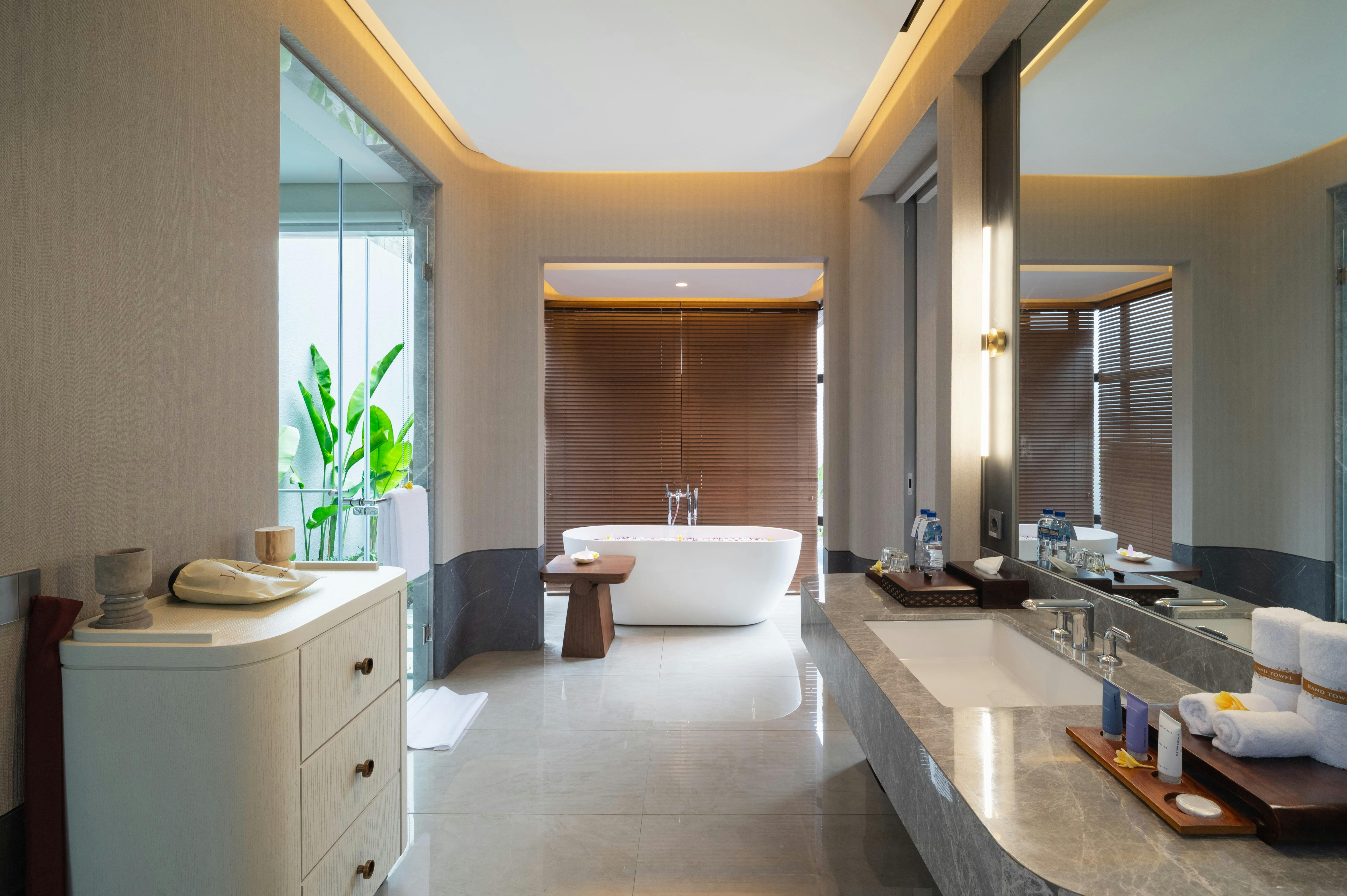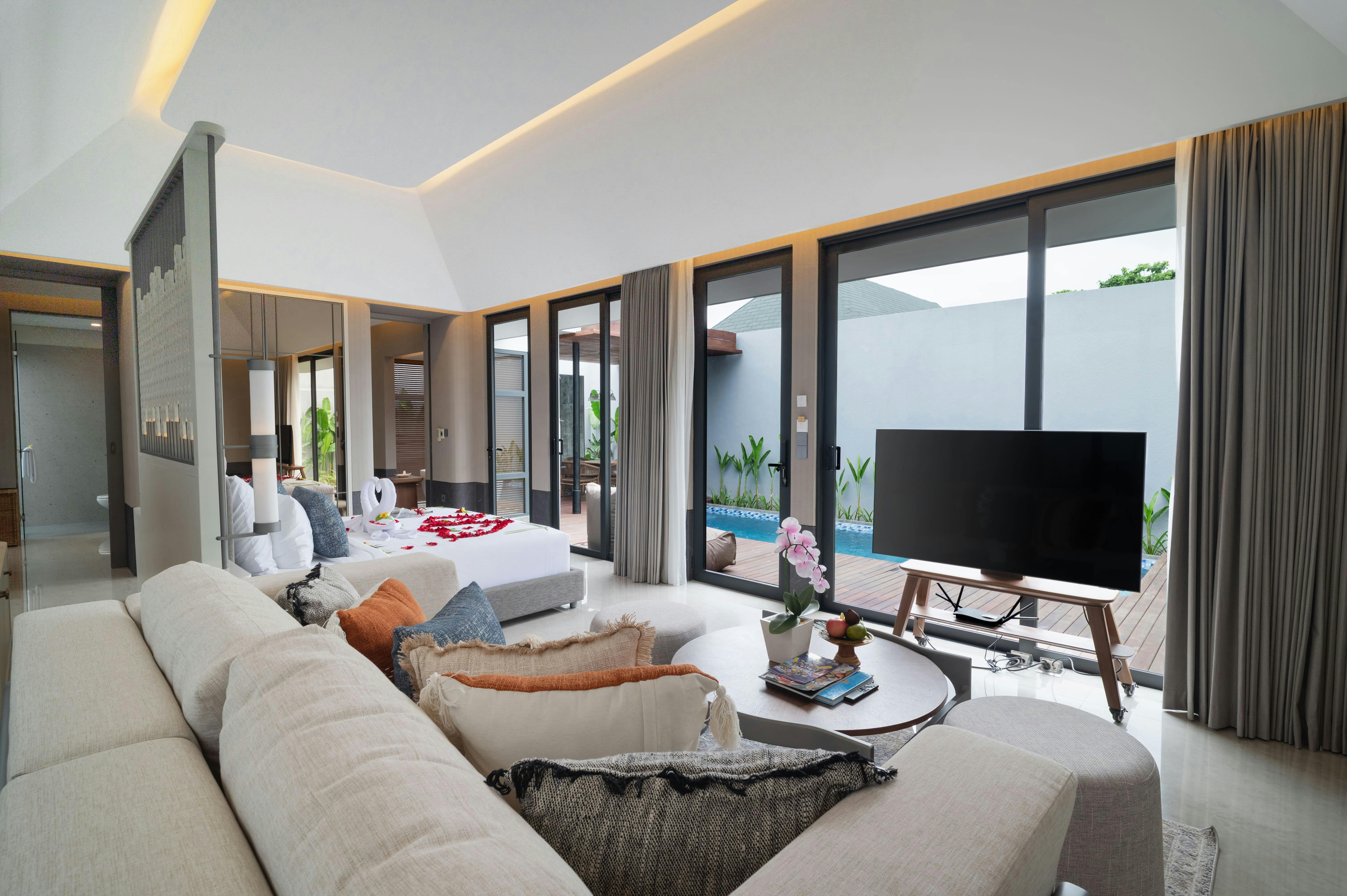 Indulge in romance at our Honeymoon Pool Villa—a luxurious and elegant retreat designed for unforgettable moments. Featuring a private pool, a serene bathtub for intimate soaking, and refined interiors with modern Balinese touches, this villa is the perfect setting to relax, reconnect, and celebrate love in total privacy.